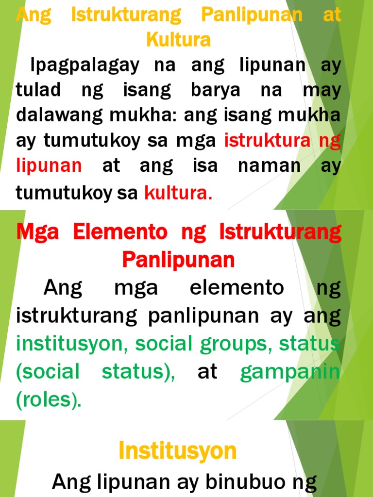 Institusyon - Kabilang dito ang mga bagay na tulad ng pamilya at pulitika na nagbibigay ng mga paraan upang makihalubilo sa isat isa. Ang istrukturang panlipunan ay mga tiyak na bagay na nararamdaman o nakikita sa loob ng isang lipunan tulad ng. Institusyon- Ito ay isang organisadong sistema ng ugnayan sa isang lipunan.