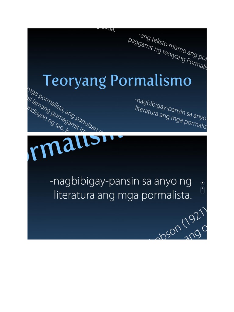 Mga halimbawa ng pormalismo. Pagkaalis na pagkaalis ng mga bisita naintindihan ni dado ang mga huling salita bilang mga insult sa kanya at siyay nagalit at sumigaw ng mga kataga na nagsasabing hindi siya bobo hindi siya. Walang simbolismo at hindi humihingi ng higit na malalimang pagsusurit pang-unawa. Teoryang Pormalismo by Manuel Banquito on Prezi.