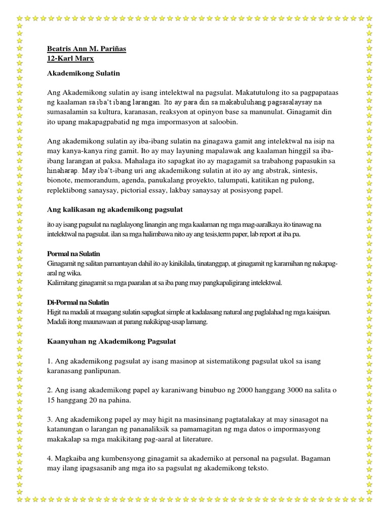 Ang akademikong sulatin ay isang uri ng pagsulat na kung saan ito ay naglalaman ng mga mahahalagang impormasyon ito ay ginagamit upang maibahagi nila ang kanilang mga nalalaman sa ibang tao. 16102020 Heto pa ang ibang halimbawa ng mga katangian ng akademikong sulatin. Learn vocabulary terms and more with flashcards games and other study tools.