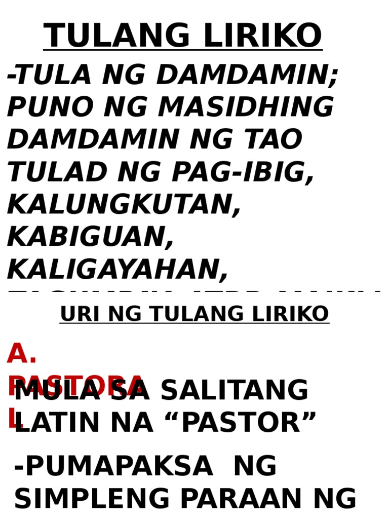 Tulang Liriko o Tulang Damdamin lyric poetry - Ito ay nagtataglay ng mga karanasankaisipanguni-gunipangarap at ibat ibang damdaming maaaring madama ng may akda o ng ibang tao. Maaaring bigkasin bilang pagdakila sa isang bagay. Mga halimbawa ng mga tulang soneto tulang oda tulang elehiya tulang pastoral tulang dalit tulang awiting.