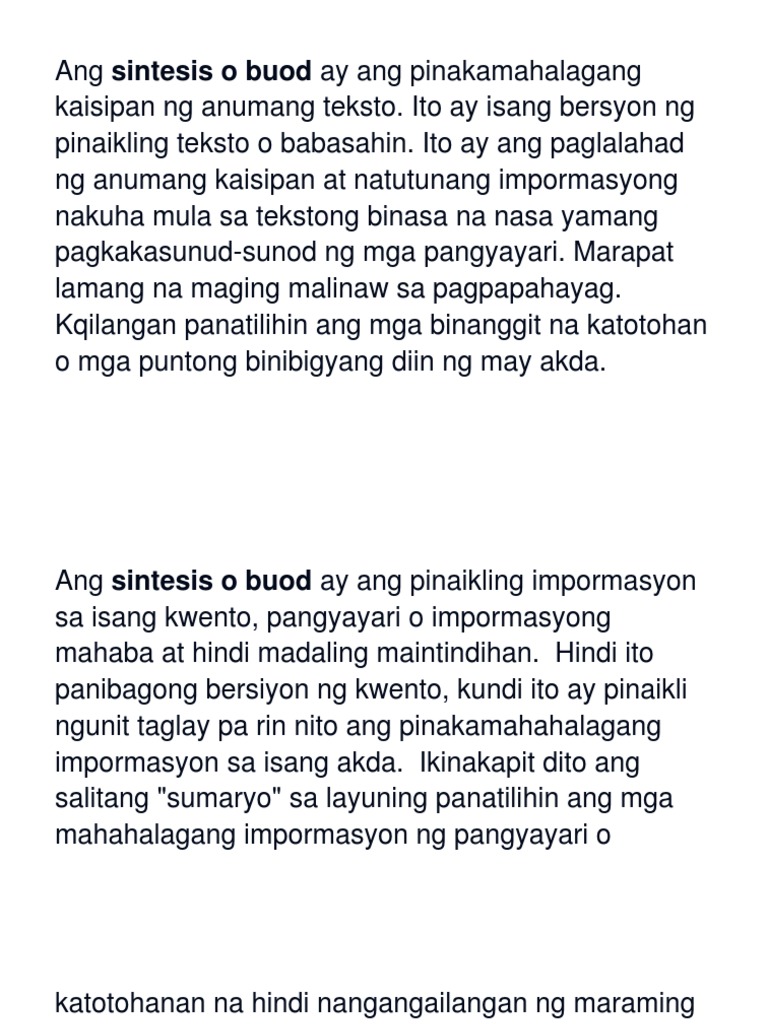 Mga halimbawa ng sintesis o buod. Hindi ito isang panibagong kwento ngunit ang pinakaikling pagsasadula ng mga importanteng ganap sa isang kwento. Ito ay ang paglalahad ng anumang kaisipan at natutunang impormasyong nakuha mula sa tekstong binasa na nasa yamang pagkakasunud-sunod ng mga.